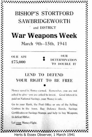 In March the financially challenged British Government launched another National Savings incentive called ‘War Weapons Week’. Heavily publicised in the national and local press, the public were asked to ‘help buy weapons to defeat Hitler’ by purchasing Defence Bonds, Savings Certificates or Savings Stamps. Rising to the challenge, organisers of the Bishop’s Stortford, Sawbridgeworth and District fund (due to take place 9–15 March) optimistically set their sites on raising £75,000. So none were more surprised than they when by the end of the week the public had invested over £184,000. In celebration of this phenomenal amount, the final day of the campaign was marked with a military parade in Sawbridgeworth and Bishop’s Stortford – a detachment of 90 armed infantry from a north of England regiment that had survived Dunkirk, marching through both towns.