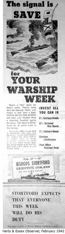 Bishop’s Stortford’s Warship Week ran from Saturday 14 February to Saturday 21 February, in which time the organisors hoped £120,000 would be raised to adopt HMS Clover – one of many Corvette class warships used to act as escorts for convoys and ward off U-boats. After a slow start it was feared the town had set its sights too high, but a late influx of cash raised the total to £126,638. Such events always provoked ‘friendly’ rivalry between Stortford and the nearby town of Saffron Walden, as to who could raise the most money. In this case Stortford came a poor second, Walden’s target of £120,000 to adopt another Corvette, HMS Marjoram, being exceeded in just 2 days.