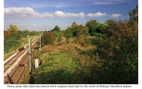 The only trace to be found now of the branch line’s former route is just north of Bishop’s Stortford station where the track left the main line heading east. Looking north from the *footbridge that crosses the railway on the Meads, the track bed can be seen on the eastern embankment within a fenced-off area running parallel to the main line. From here the line then curved in a steep climb towards another (man-made) embankment that took it onto Collins Cross bridge and across Stansted Road (See Guide 10).