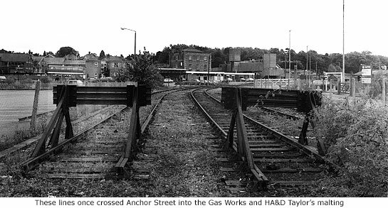Further track ran through the yard’s western boundary gate and across Anchor Street, directly into the Gas Works and riverside malthouses owned by HA & D Taylor, and to the south of the station was a loading dock and crane, plus five reception sidings mainly used for coal storage. Road transport vehicles entered the yard through a gate in London Road opposite the Tanners Arms public house. The transportation of cattle was a natural business for this market town, and three large pens were situated on that part of the yard once leased by Aggregates Industries UK. The firm moved to Harlow in 2004.