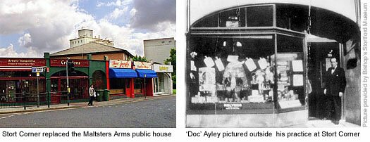 The north-east side of Station Road at its junction with South Street is called Stort Corner – the name given to the short terrace of single-storey shops built in 1926 to replace the Maltsters Arms public house (See Guide 15). In the 1930s one of these shops was the Stort Corner Pharmacy, owned by Cecil ‘Doc’ Ayley. A local chemist and dental practitioner, he apparently exhorted his patients back to good health by removing their teeth. He is probably less remembered for helping found the local Conservative Club.