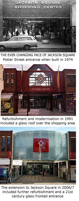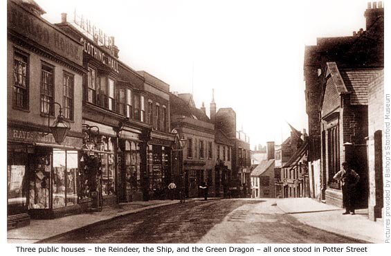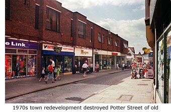 Emphasising its connection with the market place and the original boundary of the medieval town, Potter Street spans only the short distance between Apton Road and Market Square. Buildings from that period disappeared long ago as did those from the 19th century with town redevelopment in the 1970s, their place taken by Woolworths store and Jackson Square. Woolworths had aready been present on this site, albeit in smaller premises, as had Burtons Tailors, who took over the old Reindeer public house in 1948. The western side of the road fared slightly better during this period, some older buildings between Church Street and Apton Road surviving into the 1980s before being replaced.