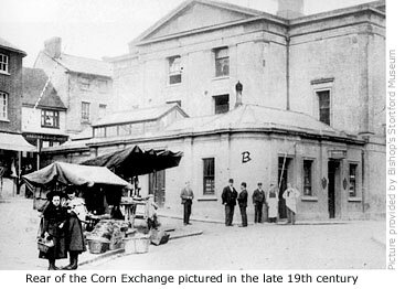In 1821 Bishop’s Stortford’s population of 3,358 were suffering the effects of the *Corn Laws like everybody else, more so the working classes who struggled to feed their families. Of more pressing concern to local farmers and landowners, however, was that Wheat Hill (now High Street), where grain had been traded since the Middle Ages, was now proving unsuitable for the task. As a result of the flourishing wheat trade corn exchanges were being built in towns and cities throughout the country, and in 1828 a consortium of local businessmen put together a plan to build a corn exchange in Bishop’s Stortford. The site chosen was that of the King’s Head Inn in the market place.