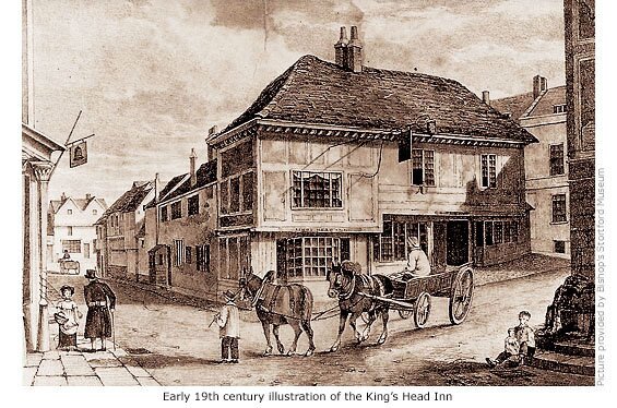 Built in 1680 the King’s Head sign portrayed Henry VIII, but an earlier sign, depicting a bunch of grapes, indicate it was first a tavern. Its elevation to ‘inn’ status was due to the growth in stagecoach travel in the 18th century, but as more and more stagecoaches journeying between London and East Anglia began to avoid the busy town centre in favour of the Hockerill bypass (See Guide 12), the King’s Head’s fortunes declined. It later gained a reputation for being a rowdy house and when the petty sessions or ‘courts’, often held there, moved to the Crown Inn at Hockerill its days were numbered. In 1828 the landlord, George Perry, had little hesitation in accepting the £3,150 offered by the Corn Exchange Company.