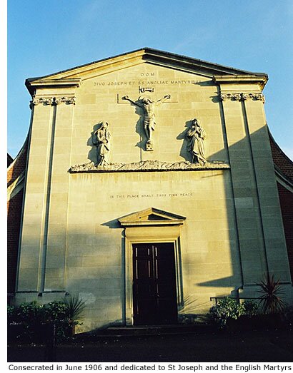 The church, dedicated to St Joseph and the English Martyrs, was consecrated on 19 June 1906 by Bishop James Fenton. Cardinal Francis Bourne should have carried out the ceremony but he was unable to make it that day. He did, however, attend the following day for the official opening to the general public.