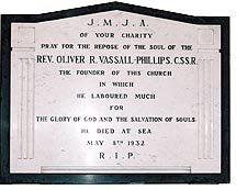 St Joseph’s church was a gift of *Father Oliver Vassall-Phillips from his own family resources, who also became the first Rector of the church. A memorial in the entrance records that he died at sea on 8 May 1932.