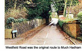 Westfield Road itself is a corruption of Waitefield and prior to 1836, when it is thought the present Hadham Road was constructed, it joined with Cricketfield Lane to form the ancient route to Little Hadham. Narrow and winding, Westfield Road now comes to an abrupt end behind the former site of the Grammar school (See Guide 3 – The Grammer School), its continuation to Cricketfield Lane lost long ago to housing development.
