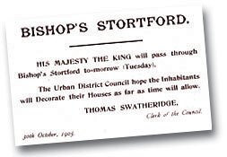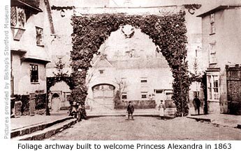When Princess Alexandra of Denmark visited Bishop’s Stortford in 1863, prior to her marriage to Edward Prince of Wales, townspeople marked the occassion by building seven huge arches of evergreen foliage at various points on her route. One of the arches straddled the road here between the Half Moon Inn and the opposite corner where Carr and Bury’s shop now stands.