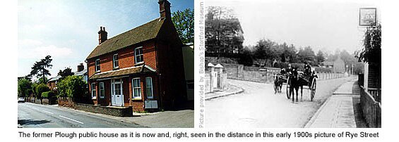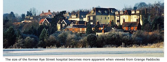 In the late 19th and early 20th century, virtually all of the land in this area, including that between Rye Street and the river, was part of the Gilbey estate. Wrought iron railings that once topped the entire length of the roadside wall have now mostly disappeared and the wall has been vandalised, but two brick pillars remain opposite Foxdells Lane indicating the former entrance to Grange Paddocks stables.