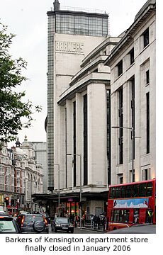 *Known as one of the poshest department stores in London, Barkers of Kensington finally closed its doors to the public in January 2006 after 135 years of trading. House of Fraser, owners of the store since 1975, said it no longer fitted in with their portfolio, partly due to a change in shopping patterns in London. What they meant by this was: despite housing such designers as Dolce and Gabbana and Versace, Kensington can no longer compete with the West End as a destination for clothes shopping. The bottom three floors of the Art Deco building (lower ground, ground and first), have been taken over by the American natural food company, Whole Foods Market, to become Britain’s first organic and health food supermarket, while the top floors are already occupied by Associated Newspapers.