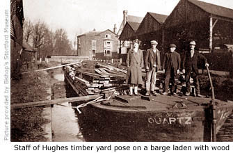 He regularly employed 60–70 men, taking on many part-time workers when times were busy to help unload the constant arrival of barges. Timber came mainly from Archangel in Russia, and despite the convenience and relative speed of road transport at this time, Hughes insisted on using horse drawn barges for transporting the timber from London’s Surrey Commercial Docks to Bishop’s Stortford, via the river Lea and Stort Navigation.