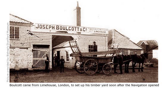 The Navigation was built primarily to carry the town’s malt production, quickly and cheaply by barge to the metropolis. For one Londoner though, a timber merchant named John Boulcott with premises in London’s dockland, it presented an opportunity to expand his business by setting up in Bishop’s Stortford.