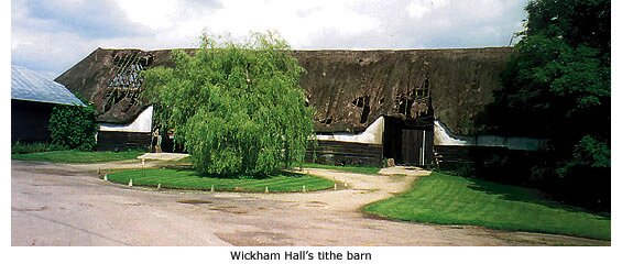 The present Wickham Hall was probably built in the early 17th century, but since that time has undergone a great deal of restoration and alteration. Timber-framed and plastered, it has two storeys and attic rooms and is built on an ‘L’ shaped plan. Now, it is probably only the rear of the house that resembles the original construction. An extremely large tithe barn is a prominent feature adjacent to the house.